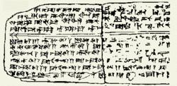The few actual examples of ancient music notation that survive usually exist on papyrus or clay tablets.[65] Information on musical practices, genres, and thought is mainly available through literature, visual depictions, and increasingly as the period progresses, instruments.[65] The oldest surviving written music is the Hurrian songs from Ugarit, Syria. Of these, the oldest is the Hymn to Nikkal (hymn no. 6; h. 6), which is somewhat complete and dated to c. 1400 BCE.[69] However, the Seikilos epitaph is the earliest entirely complete noted musical composition. Dated to the 2nd Century CE or later, it is an epitaph, perhaps for the wife of the unknown Seikilos.[70]