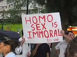 Religious protestors at a pride parade in Jerusalem, with a sign that reads, "Homo sex is immoral (Lev. 18/22)". The association of homosexual sex with immorality or sinfulness is seen by many as a homophobic act.