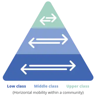 Pitirim Sorokin defines horizontal mobility as a change in religious, regional, political, or other horizontal shifts without any change in vertical position.[2]According to Andrew W. Lind, horizontal mobility occurs when a person changes their profession, but their social status remains unchanged. Eg. if a doctor switches from a job in health care to teaching in medical school, the profession changes, but dignity and social status remain the same.[3] According to Cameron Anderson, social status is the level of social value that a person is considered to have.[4] The American sociologist Linda K. George listed the social status factors in horizontal mobility as work, wealth, success, education, ethnicity, and marital status.[5]