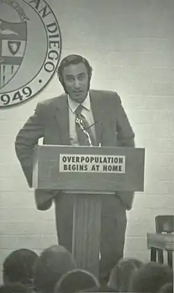 Paul R. Ehrlich's book The Population Bomb became a bestseller upon its release in 1968 and created renewed interest in overpopulation. The book predicted population growth would lead to famine, societal collapse, and other social, environmental and economic strife in the coming decades, and advocated for policies to curb it.[15][36][110] The Club of Rome published the influential report The Limits to Growth in 1972, which used computer modeling to similarly argue that continued population growth trends would lead to global system collapse.[111] The idea of overpopulation was also a topic of some works of English-language science fiction and dystopian fiction during the latter part of the 1960s.[110] The United Nations held the first of three World Population Conferences in 1974.[112] Human population and family planning policies were adopted by some nations in the late 20th century in an effort to curb population growth, including in China and India.[3] Albert Allen Bartlett gave more than 1,742 lectures on the threat of exponential population growth starting in 1969.[62]