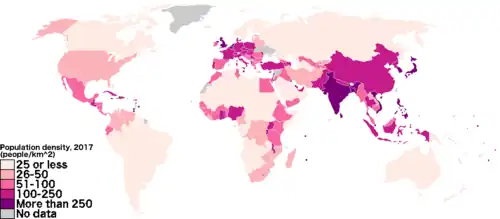 Map of population density by country, per square kilometer (See List of countries by population density.)