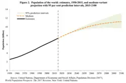 Annual world population growth peaked at 2.1% in 1968, has since dropped to 1.1%, and could drop even further to 0.1% by 2100.[1] Based on this, the United Nations projects the world population, which is 7.8 billion as of 2020, to level out around 2100 at 10.9 billion[64][65][66] with other models proposing similar stabilization before or after 2100.[3][4][5] Some experts believe that a combination of factors (including technological and social change) would allow global resources to meet this increased demand, avoiding global overpopulation.[67][68] Additionally, some critics dismiss the idea of human overpopulation as a science myth connected to attempts to blame environmental issues on overpopulation, oversimplify complex social or economic systems, or place blame on developing countries and poor populations—reinscribing colonial or racist assumptions and leading to discriminatory policy.[62][11][69][36] These critics often suggest overconsumption should be treated as an issue separate from population growth.[70][71]