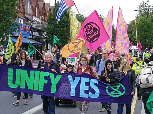 Extinction Rebellion (XR) are a climate justice movement with three major demands to the UK government: declare a climate emergency; achieve carbon neutrality by 2025; and create a citizens' assembly on climate change.[1] For the Impossible Rebellion, which ran from 23 August 2021 to 4 September 2021, the movement also demanded that the government cease new fossil fuel investments.[2]