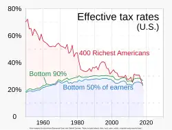 In 2018, and for the first time in U.S. history, U.S. billionaires paid a lower effective tax rate than the working class. A study found that the average effective tax rate paid by the richest 400 families in the country was 23 percent, a full percentage point lower than the 24.2 percent rate paid by the bottom half of American households.[48][49]