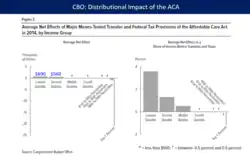 - The Affordable Care Act. CBO estimated the ACA shifted approximately $21,000 in after-tax income from the average top 1% household via the investment income tax and the Medicare tax, to provide $600 in health insurance subsidies to the average bottom 40% household via insurance subsidies and expanded Medicaid.[43] The Medicaid and CHIPs expansions amounted to 80% of the increase in means-tested transfers between 1979 and 2016.[29]