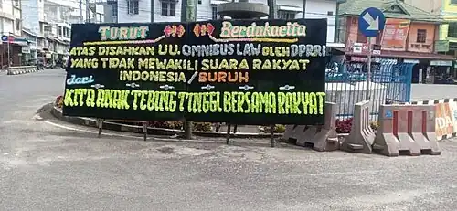The law sparked protests, originating in Java in January 2020.[29] Protesters are concerned that the law could hurt both workers, specifically that it "would harm workers by reducing severance pay, cutting mandatory leave, allowing longer work hours, and permitting the hiring of contract and part-time workers in place of full-time employees"; and the environment, specifically that it "would lead to the deforestation of forests that are essential in controlling carbon emissions and slowing climate change" according to environmentalists.[27] Several labour unions say that the law should include representatives from labour unions and not just investors.[30] The government says that the law could help Indonesia's fallen economy during the COVID-19 pandemic. As of 8 October, at least 400 protesters have been detained, ranging from peaceful protesters to rioters.[31]