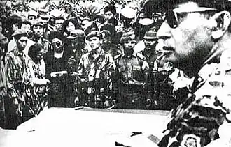 The balance of power was shifted in favour of anti-communists in December 1965, when personnel from both the Army Para-commando Regiment and 5th Brawijaya Military Region units arrived in Bali after having carried out killings in Java. Led by Suharto's principal troubleshooter, Sarwo Edhie Wibowo, Javanese military commanders permitted Balinese squads to kill until reined in.[86] In contrast to Central Java, where the Army encouraged people to kill the "Gestapu", Bali's eagerness to kill was so tremendous and spontaneous that, having provided logistic support initially, the Army eventually had to step in to prevent chaos.[87] Sukarno's choice of Bali's provincial governor, Suteja, was recalled from office and accused of preparing a communist uprising, and his relatives were tracked down and killed.[88] A series of killings similar to those in Central and East Java were led by black-shirted PNI youth. For several months, militia death squads went through villages capturing suspects and taking them away.[69] Hundreds of houses belonging to communists and their relatives were burnt down within one week of the reprisal crusade, with occupants being butchered as they ran from their homes. An early estimate suggested that 50,000 people, including women and children, were killed in this operation alone. The population of several Balinese villages were halved in the last months of 1965.[89] All the Chinese shops in the towns of Singaraja and Denpasar were destroyed, and many of their owners who were alleged to have financially supported the "Gestapu" killed.[89] Between December 1965 and early 1966, an estimated 80,000 Balinese were killed, roughly 5% of the island's population at the time, and proportionally more than anywhere else in Indonesia.[90]