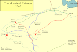 Britain was the world leader in the construction of railways, and their use to expand trade and coal supplies. The first successful locomotive-powered line in Scotland, between Monkland and Kirkintilloch, opened in 1826. By the late 1830s there was a network of railways that included lines between Dundee and Arbroath, and connecting Glasgow, Paisley and Ayr. The line between Glasgow and Edinburgh, largely designed for passenger transport, opened in 1842 and proved highly successful. By the mid-1840s the mania for railways had begun.[47] A good passenger service established by the late 1840s, and a network of freight lines reduced the cost of shipping coal, making products manufactured in Scotland competitive throughout Britain.[48] The North British Railway was formed in 1844 to link Edinburgh and eastern Scotland with Newcastle and the next year the Caledonian Railway began connecting Glasgow and the west to Carlisle. The creation of a dense network in the Lowlands with connections to England would take until the 1870s to complete.[49]