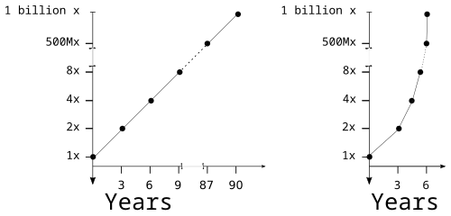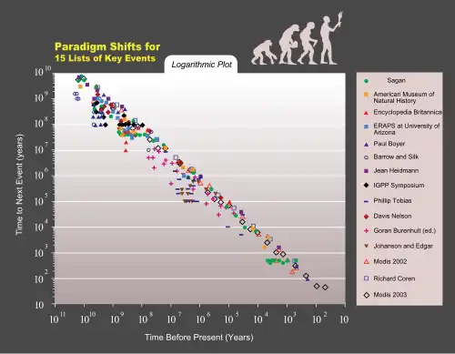 In addition to general criticisms of the singularity concept, several critics have raised issues with Kurzweil's iconic chart. One line of criticism is that a log-log chart of this nature is inherently biased toward a straight-line result. Others identify selection bias in the points that Kurzweil chooses to use. For example, biologist PZ Myers points out that many of the early evolutionary "events" were picked arbitrarily.[91] Kurzweil has rebutted this by charting evolutionary events from 15 neutral sources, and showing that they fit a straight line on a log-log chart. Kelly (2006) argues that the way the Kurzweil chart is constructed with x-axis having time before present, it always points to the singularity being "now", for any date on which one would construct such a chart, and shows this visually on Kurzweil's chart.[92]