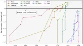 Human-level AI around 2029 and the singularity in 2045 was predicted by Kurzweil in 2005.[37][38] He reaffirmed these predictions in 2024 in The Singularity is Nearer.[39]