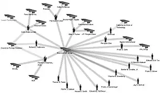 The largest corporations tend to have the most interlocks, and also tend to have interlocks with each other, placing them at the center of the network.[25] Major banks, in particular, tend to be at the center of the network and have large numbers of interlocks.[26][27][28] With the globalization of financial capital following World War II, multinational interlocks have become progressively more common.[29] As the Cold War escalated, well-connected members of the CIA harnessed these interconnections to launder money through front foundations, as well as more substantial institutions such as the Ford Foundation.[30] A relatively small number of individuals—a few dozen—bind this multinational network together by participating in transnational interlocks and sitting on the boards of multiple global policy groups (such as the Council on Foreign Relations).[31]