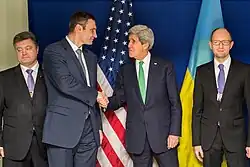 On 4 February 2014,[61] a YouTube post[62] revealed a phone conversation between Victoria Nuland, Assistant Secretary of State for European and Eurasian Affairs, and Geoffrey R. Pyatt, United States Ambassador to Ukraine, in which Nuland, referring to Vitali Klitschko as 'Klitsch' and Arseniy Yatsenyuk as 'Yats', stated "I don't think Klitsch should go into the government. I don't think it's necessary. I don't think it's a good idea... I think Yats is the guy... ." Nuland went on to state that Robert Serry and UN Secretary General Ban Ki-moon will be used to put pressure on Ukrainian leaders, including the opposition, to circumvent the EU, specifically Nuland exclaimed "and, you know, fuck the E.U."[63]
