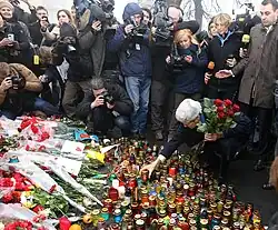 Similar events were reported on 26 November in Warsaw,[94] Kraków,[95] Łódź,[96] Poznań,[97] Wrocław,[98] Katowice,[99] Lublin,[100] Rzeszów,[100] Olsztyn,[101] Elbląg,[102] Zamość,[103] Biały Bór,[104] London, Paris, Munich, Berlin, Frankfurt, Stuttgart, Budapest, Oslo, Bergen, Stockholm, Malmö, Lund, Vienna, Bratislava, Vilnius,[105] Tbilisi, Toronto (150),[106] Winnipeg (100+),[107] Saskatoon,[108] Edmonton (150),[109] Cleveland (Parma),[110] Sofia,[111] and The Hague.[112] Simultaneous support events were organized by Baltic nationalist youth movements on 3 December in Tallinn, Riga and Vilnius.[113] And one in Amsterdam on 7 December.[114]