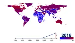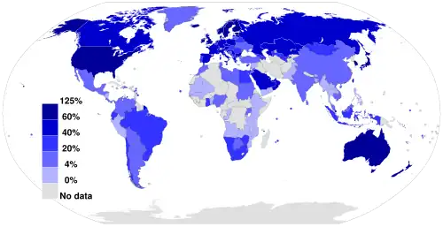 Between 2000 and 2009, the number of Internet users globally rose from 390 million to 1.9 billion.[100] By 2010, 22% of the world's population had access to computers with 1 billion Google searches every day, 300 million Internet users reading blogs, and 2 billion videos viewed daily on YouTube.[101] In 2014 the world's Internet users surpassed 3 billion or 44 percent of world population, but two-thirds came from the richest countries, with 78 percent of Europeans using the Internet, followed by 57 percent of the Americas.[102] However, by 2018, Asia alone accounted for 51% of all Internet users, with 2.2 billion out of the 4.3 billion Internet users in the world. China's Internet users surpassed a major milestone in 2018, when the country's Internet regulatory authority, China Internet Network Information Centre, announced that China had 802 million users.[103] China was followed by India, with some 700 million users, with the United States third with 275 million users. However, in terms of penetration, in 2022 China had a 70% penetration rate compared to India's 60% and the United States's 90%.[104] In 2022, 54% of the world's Internet users were based in Asia, 14% in Europe, 7% in North America, 10% in Latin America and the Caribbean, 11% in Africa, 4% in the Middle East and 1% in Oceania.[105] In 2019, Kuwait, Qatar, the Falkland Islands, Bermuda and Iceland had the highest Internet penetration by the number of users, with 93% or more of the population with access.[106] As of 2022, it was estimated that 5.4 billion people use the Internet, more than two-thirds of the world's population.[107]