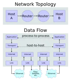 Below this top layer, the transport layer connects applications on different hosts with a logical channel through the network. It provides this service with a variety of possible characteristics, such as ordered, reliable delivery (TCP), and an unreliable datagram service (UDP).