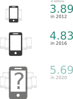 The International Telecommunication Union (ITU) estimated that, by the end of 2017, 48% of individual users regularly connect to the Internet, up from 34% in 2012.[72] Mobile Internet connectivity has played an important role in expanding access in recent years, especially in Asia and the Pacific and in Africa.[73] The number of unique mobile cellular subscriptions increased from 3.9 billion in 2012 to 4.8 billion in 2016, two-thirds of the world's population, with more than half of subscriptions located in Asia and the Pacific. The number of subscriptions was predicted to rise to 5.7 billion users in 2020.[74] As of 2018, 80% of the world's population were covered by a 4G network.[74] The limits that users face on accessing information via mobile applications coincide with a broader process of fragmentation of the Internet. Fragmentation restricts access to media content and tends to affect the poorest users the most.[73]