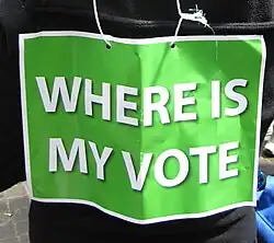 Where is my vote? (Persian: رأی من کجاست؟ ra'y-e-man kojāst?) is a motto which was used during the protests. The Iranian government, headed by President Mahmoud Ahmadinejad, released results claiming a two-thirds majority. However, Mousavi had already claimed victory before the vote count was done[60] and supporters of Mousavi and Karroubi accused the government of rigging the votes.