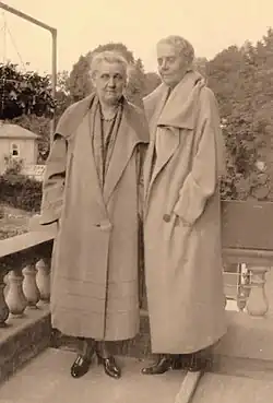 Her second romantic partner was Mary Rozet Smith, who was wealthy and supported Addams's work at Hull House, and with whom she shared a house.[74] Historian Lilian Faderman wrote that Jane was in love and she addressed Mary as "My Ever Dear", "Darling" and "Dearest One", and concluded that they shared the intimacy of a married couple. They remained together until 1934, when Mary died of pneumonia, after 40 years together.[75] It was said that, "Mary Smith became and always remained the highest and clearest note in the music that was Jane Addams' personal life".[76] Together they owned a summer house in Bar Harbor, Maine. When apart, they would write to each other at least once a day – sometimes twice. Addams would write to Smith, "I miss you dreadfully and am yours 'til death".[77] The letters also show that the women saw themselves as a married couple: "There is reason in the habit of married folks keeping together", Addams wrote to Smith.[78]