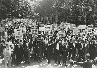 During the civil rights movement (1954–1968), American Jews and African Americans formed strategic alliances to challenge racial inequality and injustice across the country. This built on earlier solidarity between the two communities, which had resulted in, among other things, Jewish activists taking many of the leadership positions within the early NAACP.[1][2] Jewish individuals and organizations provided financial support, legal expertise, and grassroots activism to support the growing movement nationwide.[1][2] Prominent Jewish organizations involved in this "Grand Alliance" included the Anti-Defamation League and the American Jewish Congress.[3] Prominent Jewish leaders such as Rabbi Abraham Joshua Heschel and Jack Greenberg marched alongside figures like Martin Luther King Jr. and contributed significantly to landmark legal victories.[4]
