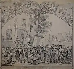 A famous lithograph by David Levi Elkan, simply known as "Die Trierer", depicts several students, and among them, Karl Marx, in front of the White Horse in 1836.[b]