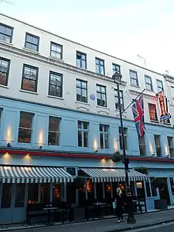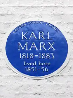 Marx lived at 28 Dean Street, Soho, London from 1851 to 1856. An English Heritage Blue plaque is visible on the second floor.