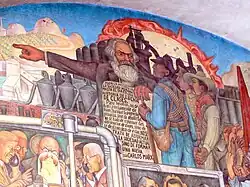 Marx's critiques of history, society and political economy hold that human societies develop through class conflict. In the capitalist mode of production, this manifests itself in the conflict between the ruling classes (the bourgeoisie) that control the means of production and the working classes (the proletariat) that enable these means by selling their labour power for wages.[4] Employing his historical materialist approach, Marx predicted that capitalism produced internal tensions like previous socioeconomic systems and that these tensions would lead to its self-destruction and replacement by a new system known as the socialist mode of production. For Marx, class antagonisms under capitalism—owing in part to its instability and crisis-prone nature—would eventuate the working class's development of class consciousness, leading to their conquest of political power and eventually the establishment of a classless, communist society constituted by a free association of producers.[5] Marx actively pressed for its implementation, arguing that the working class should carry out organised proletarian revolutionary action to topple capitalism and bring about socio-economic emancipation.[6]