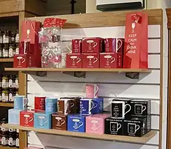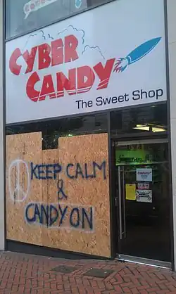 In 2000, Stuart Manley, co-owner with his wife Mary of Barter Books Ltd. in Alnwick, Northumberland, was sorting through a box of second-hand books bought at auction when he uncovered one of the original "Keep Calm and Carry On" posters.[3] The couple framed it and hung it up by the cash register; it attracted so much interest that Manley began to produce and sell copies.[25][26] In late 2005, Guardian journalist Susie Steiner featured the replica posters as a Christmas gift suggestion, raising their profile still further.[3][27] Other companies followed the Manleys' example, and the design rapidly began to be used as the theme for a wide range of products.[28] Mary Manley later commented, "I didn't want it trivialised; but of course now it's been trivialised beyond belief."[28]