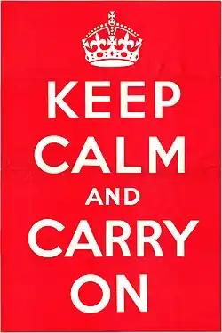 Keep Calm and Carry On was a motivational poster produced by the Government of the United Kingdom in 1939 in preparation for World War II. The poster was intended to raise the morale of the British public, threatened with widely predicted mass air attacks on major cities.[1][2] Although 2.45 million copies were printed, and the Blitz did in fact take place, the poster was only rarely publicly displayed and was little known until a copy was rediscovered in 2000 at Barter Books, a bookshop in Alnwick.[3] It has since been re-issued by a number of private companies, and has been used as the decorative theme for a range of products.[4]