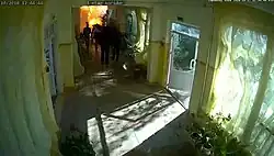 ![]() Snapshot of CCTV footage showing the 18-year-old student perpetrator Vladislav Roslyakov descending a flight of stairs in the college building during the massacre | |