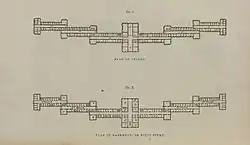 The Kirkbride Plan asylums tended to be large, imposing institutional buildings,[9] with the defining feature being their "narrow, stepped, linear building footprint" featuring staggered wings extending outward from the center, resembling the wingspan of a bat.[10] The standard number of wings for a Kirkbride Plan hospital was eight,[11] with an accommodation of 250 patients.[12] Kirkbride's philosophy behind the staggered wings was to allow individual corridors open to sunlight and air ventilation through both ends, which he believed aided in healing the mentally ill.[10] Each wing, according to Kirkbride's original guidelines, would house a separate ward, which would contain its own "comfortably furnished" parlor, bathroom, clothes room, and infirmary, as well as a speaking tube and dumbwaiter to allow open communication and movement of materials between floors.[13][14] The wings furthest from the center complex of the building were reserved for the "most excitable," or most physically dangerous and volatile patients.[10] Patient rooms were suggested to be spacious, with ceilings "at least 12 feet (3.7 m) high," but only large enough to room a single person.[15] The center complexes of the Kirkbride Plan buildings were designed to house administration, kitchens, public and reception areas, and apartments for the superintendent's family.[16] Architectural styles of Kirkbride Plan buildings varied depending on the appointed architect, and ranged from Richardsonian Romanesque to Neo-Gothic.[17]