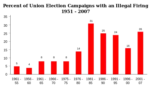 Between 2005 and 2014, the National Labor Relations Board recorded 18,577 labor union representation elections; in 11,086 of these elections (60 percent), the majority of workers voted for union representation. Most of the elections (15,517) were triggered by employee petitions for representation, of which unions won 9,933. Less common were elections caused by employee petitions for decertification (2,792, of which unions won 1,070), and employer-filed petitions for either representation or decertification (268, of which unions won 85).[63][64]