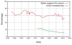 Public approval of unions climbed during the 1980s much as it did in other industrialized nations,[83] but declined to below 50% for the first time in 2009 during the Great Recession. It is not clear if this is a long-term trend or a function of a high unemployment rate which historically correlates with lower public approval of labor unions.[84]