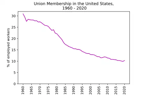 In 2023, the Bureau of Labor Statistics reported that labor union membership hit an all-time low in the U.S., dropping from 10.3% to 10.1%.[60][61][62]