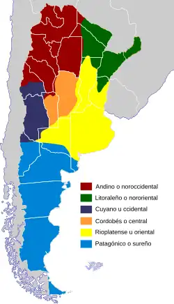The de facto[A] official language is Spanish, spoken by almost all Argentines.[6] Due to the extensive Argentine geography, Spanish has a strong variation among regions, although the prevalent dialect is Rioplatense, primarily spoken in the La Plata Basin and accented similarly to Neapolitan language.[7]