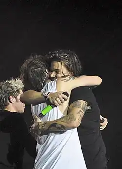Former One Direction bandmate Zayn Malik addressed the conspiracy in 2015, saying there were no secret relationships within the band and the belief had taken a toll on Styles and Tomlinson, who refrained from physically intimate behaviour like hugging as a result.[38][39] Band member Liam Payne said in 2015 that symbols at One Direction concerts like rainbow flags to indicate support of the conspiracy "drives [him] insane".[40]