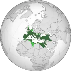 In the Eastern Roman Empire, and the broader Greek-Orthodox world, Latins was a synonym for all people who followed the Roman Catholicism[4] of Western Christianity,[5] regardless of ethnicity.[6] The term was related to the predominance of the Latin Church, which is the largest autonomous particular church within the broader Catholic Church, and took its name from its origins in the Latin-speaking world which had Rome as its center.[7]