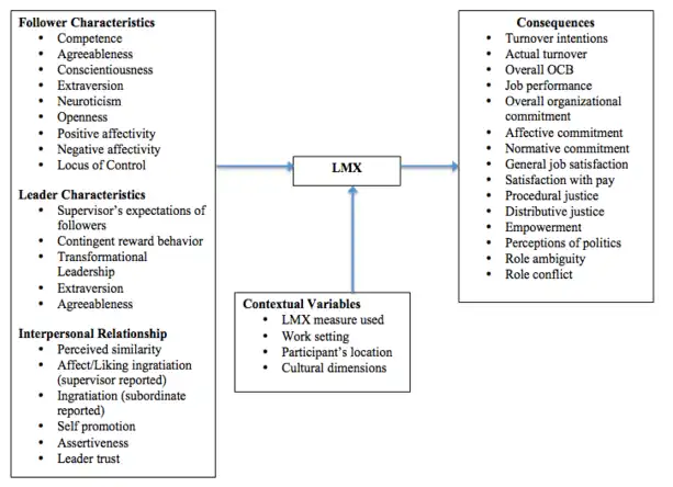 Dulebohn et al. identify three primary groups of antecedents: leader characteristics, follower characteristics, and interpersonal relationships.[7] Followers are evaluated by their competence, agreeableness, conscientiousness, extraversion, neuroticism, and openness, positive affectivity, negative affectivity, and locus of control.[7] Leaders are evaluated based on supervisor's expectation of followers, contingent reward behavior, transformational leadership, extraversion, and agreeableness.[7] Although the leader takes a dominant role in creating an LMX relationship, the follower also plays an important part in creating the relationship. Interpersonal relationship variables that may affect this relationship are perceived similarity, affect/liking, integration, self-promotion, assertiveness, and leader trust.[7] This variety of characteristics creates the basis for LMX and allows it to be successful or unsuccessful, depending on the present traits.