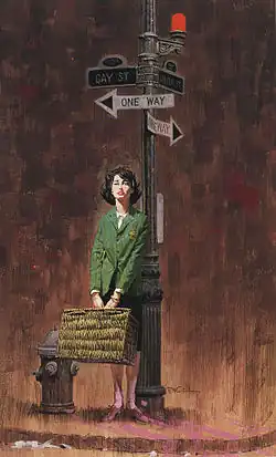 Lesbian pulp novels typically had lurid, titillating cover art. Because lesbian pulps were not typically bought by libraries, cover art played a big factor in their selling.[2] Although many women (lesbian and otherwise) bought and read these novels, book publishers marketed them to men as erotic fantasy. Covers might have a few provocative lines of text meant to draw attention to the sexy and scandalous nature of what was between the covers. Publishers inserted words such as "twilight", "odd", "strange", "shadows", and "queer" in the titles of these books.[24] Author Ann Bannon has stated that men would read the covers literally, attracted to the art of half-dressed women in a bedroom scene, and women would read the covers iconically: two women looking at each other, or one woman standing, another on a bed, with the trigger words of "strange" or "twilight" meaning that the book had lesbian content in it.