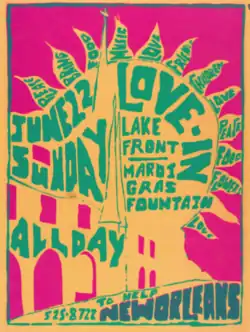 The First Love-in started before dawn.[10] The Los Angeles Free Press promoted the event.[10] 15,000 people[11] crowded in a natural amphitheater in Elysian Park, and listened to the psychedelic rock bands Strawberry Alarm Clock, The Peanut Butter Conspiracy, Clear Light, and the Flamin' Groovies.[12][13][14]