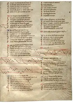 The Gruuthuse manuscript - written in Middle Dutch - composed around 1400 in Bruges contains 147 songs, including a number of love songs with musical notation. The manuscript is from several lyricists, mostly unknown.[4][5]