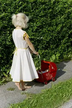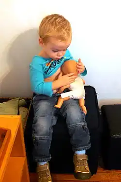 Pretense with dolls begins when a child extends pretend self actions to a doll. A child might start by pretending to feed themselves, then reach out and pretend to be feeding a doll. This is further developed when a child begins giving the doll an active role rather than a passive one.[1] For example, the doll does not just eat when fed by the child, instead, the child pretends that the doll reaches for the spoon and feeds itself. After the doll is given an active role, the child begins to bestow upon it sensory and emotional attributes, such as feeling sad, happy, or hurt.[2] The highest form of doll play appears when a child is about 3 and a half years of age. At this point, the child is capable of giving the doll cognitive abilities.[2]