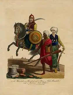 The most enduring Mamluk realm was the knightly military class in medieval Egypt, which developed from the ranks of slave-soldiers.[12] Originally the Mamluks were slaves of Turkic origins from the Eurasian Steppe,[15] but the institution of military slavery spread to include Circassians,[17] Abkhazians,[18][19][20] Georgians,[24] Armenians,[26] Russians,[10] and Hungarians,[9] as well as peoples from the Balkans such as Albanians,[9][27] Greeks,[9] and South Slavs[29] (see Saqaliba). They also recruited from the Egyptians.[13] The "Mamluk/­Ghulam Phe­nom­enon",[8] as David Ayalon dubbed the creation of the specific warrior class,[30] was of great political importance; for one thing, it endured for nearly 1,000 years, from the 9th century to the early 19th century.