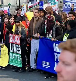 George Clooney and Scooter Braun were major forces behind the organization of the march, and aided in fundraising efforts behind the scenes.[37] Amal and George Clooney donated $500,000 to support the march and announced they would attend. Oprah Winfrey matched the Clooney donation to support the march.[38][39] Jeffrey Katzenberg and his wife Marilyn also contributed $500,000.[40] Film director and producer Steven Spielberg and actress Kate Capshaw Spielberg donated $500,000, also matching the donation of the Clooneys.[41] On February 23, Gucci announced they were also donating $500,000 towards the march.[42] Other people and organizations offering support have included Selena Gomez, Justin Bieber,[43] Gabby Giffords, Lauren Jauregui, Alyssa Milano, Moms Demand Action, Amy Schumer, St. Vincent, Harry Styles,[44] Hayley Williams,[45][46] Paul McCartney,[47] Kanye West, and Kim Kardashian.[48] John Legend and Chrissy Teigen donated $25,000.[49] Jimmy Fallon pledged to attend an event with his family.[50] Samantha Bee interviewed kids.[51] Jim Jefferies interviewed participants in San Diego.[52] Other celebrities including Taylor Swift have donated an undisclosed amount of money toward the campaign.[53] Justin Timberlake, Will Smith, Cher and Amy Poehler also participated in the march.[54]
