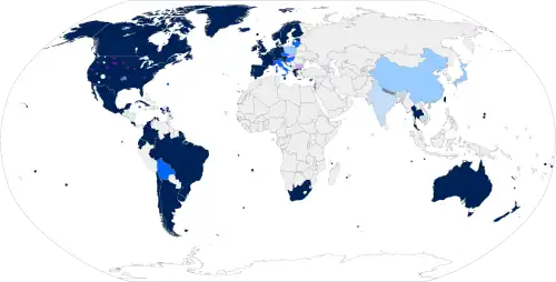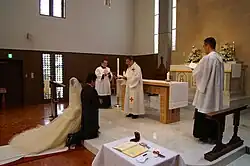While it is a relatively new practice to grant same-sex couples the same form of legal marital recognition as commonly granted to mixed-sex couples, there is some history of recorded same-sex unions around the world.[46] Ancient Greek same-sex relationships were like modern companionate marriages, unlike their different-sex marriages in which the spouses had few emotional ties, and the husband had freedom to engage in outside sexual liaisons. The Codex Theodosianus (C. Th. 9.7.3) issued in 438 CE imposed severe penalties or death on same-sex relationships,[47] but the exact intent of the law and its relation to social practice is unclear, as only a few examples of same-sex relationships in that culture exist.[48] Same-sex unions were celebrated in some regions of China, such as Fujian.[49] Possibly the earliest documented same-sex wedding in Latin Christendom occurred in Rome, Italy, at the San Giovanni a Porta Latina basilica in 1581.[50]