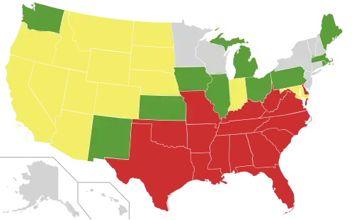Child marriage was common throughout history, even up until the 1900s in the United States, where in 1880, in the state of Delaware, the age of consent for marriage was 7 years old.[38] Still, in 2017, over half of the 50 United States have no explicit minimum age to marry and several states set the age as low as 14.[39] Today it is condemned by international human rights organizations.[40][41] Child marriages are often arranged between the families of the future bride and groom, sometimes as soon as the girl is born.[40] However, in the late 1800s in England and the United States, feminist activists began calling for raised age of consent laws, which was eventually handled in the 1920s, having been raised to 16–18.[42]