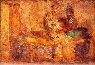The lighting of a sacred torch in honor of Ceres was part of the celebration, intended to impart fertility upon the couple.[38] A wedding sacrifice was also offered, with a sow being the most likely choice.[39][40] The day after the wedding, the husband would hold a dinner party, and the bride made an offering to the Lares and other domestic deities of her new home.[37][41]