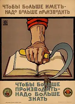 During the 1930s, the rapid industrialisation of the country accelerated the Soviet people's sociological transition from poverty to relative plenty when politically illiterate peasants passed from Tsarist serfdom to self-determination and became politically aware urban citizens.[122] The Marxist–Leninist economic régime modernised Russia from the illiterate, peasant society characteristic of monarchy to the literate, socialist society of educated farmers and industrial workers. Industrialisation led to a massive urbanisation in the country.[122] Unemployment was virtually eliminated in the country during the 1930s.[122] However, this rapid industrialisation also resulted in the Soviet famine of 1930–1933 that killed millions.[123][124]