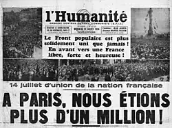 Since 1936, with an interruption under Vichy and German occupation, the French Communist Party (PCF), the General Confederation of Labor (CGT), and various associated movements such as the League of Human Rights[2] have organized a parade in Paris to celebrate the "values of the Republic" on the national holiday. And since 1950, the Algerian independence activists of the Movement for the Triumph of Democratic Liberties (MTLD), led by Messali Hadj, have taken part in the parade,[3] despite their differences with the French Communists, who have not yet declared their support for Algerian independence, even though they demonstrated and went on strike in 1949-1950 for the independence of Indochina, at the initiative of the Indochinese Communists. The "Algerian" part of the parades quickly became very prominent, reaching one-third or even half of the May 1 parade in 1953, according to estimates.