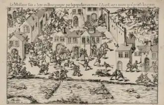 The notables put their plan into action on 12 April, taking advantage of the increase in support from rural pilgrims in the town for the feast of Saint Savinien. In the early hours the mayor ordered the people to tear down the Huguenot church. This accomplished, later in the day after the feast, he ordered the militia to arrest the Protestant leadership of the town, catching them off guard with their Gascon captain Mombaut out of the city for the afternoon.[13] The arrests were incompetently carried out, but when Mombaut returned he gathered the Huguenots together in a fortified house and prepared a defence. The Catholics brought artillery to bear on the house, and in the ensuing hours Mombaut and those with him were killed.[14] The mayor and the militia lost control of the proceedings and a general massacre of the town's Huguenot population ensued, the rural pilgrims from out of town setting themselves upon the burghers, with over 50 houses looted and 100 killed.[15] The authorities sought in vain to re-establish control on 13 April but their orders were ignored.[16] The bodies were thrown into the Yonne, a tributary of the Seine, and several days later Pierre Paschal would report seeing bodies in the river near Paris.[17]