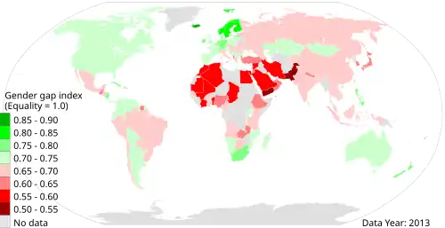 Social Institutions and Gender Index (SIGI) is a composite indicator of gender equality that solely focuses on social institutions that affect the equality between men and women, as well as on the four dimensions of family code, physical integrity, ownership rights and civil liberties. It was introduced in 2007 by the OECD Development Centre to address the perceived inadequacies of the GDI, GEM, GEI, and Global Gender Gap Index. Social institutions comprise norms, values and attitudes that exist in a society in relation to women.[5] SIGI's authors argue that it is "the only index that focuses on the underlying sources of gender inequality", through they note it is indented to supplement, not replace, the aforementioned other existing measures; they also note that this topic is likely too complex for a single indicator, and recommend a multi-indicator approach for any studies that want to aim to be more comprehensive.[5] The tool has been praised for being a valuable measure for developing countries, but criticized as less applicable for the developed ones.[6]